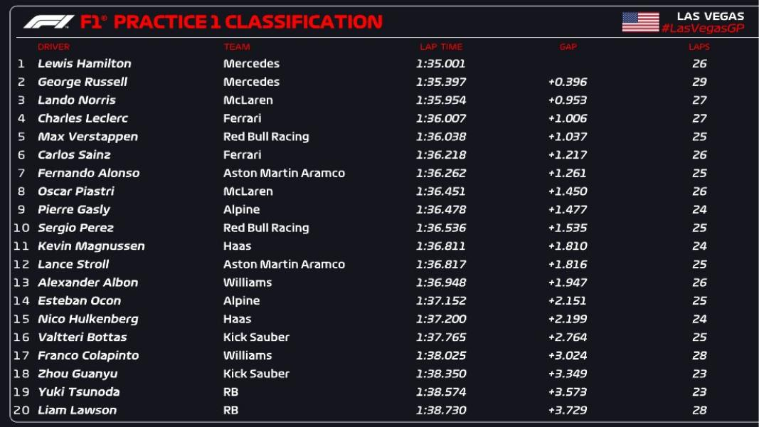 Franco Colapinto completó el primer entrenamiento libre en el GP de Las Vegas de la Fórmula 1. Finalizó en el puesto 17°, a 3.02 segundos de Lewis Hamilton -1m35s001- que terminó como puntero de la prueba.
