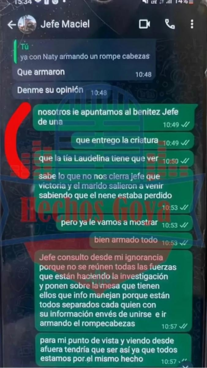 “Nosotros le apuntamos al Benitez, jefe, de una que entregó la criatura”, arriesgó una efectivo. En el siguiente mensaje señaló la potencial participación de otra de las personas que más tarde serían detenidas. “La tía Ladelina tiene que ver”, hipotetizaron en la conversación.