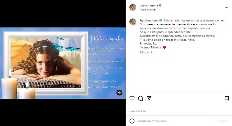 La creadora de Margarita publicó un video con una foto de Romina en un marco e imágenes de velas y mariposas celestes a su alrededor. “Hijita amada, hoy estás más que siempre en mí. Sos presencia permanente que me abre el corazón, me lo agranda, me duermo con vos y me despierto con vos. Sé que estás porque aprendí a sentirte”, indicó Cris Morena en voz en off.