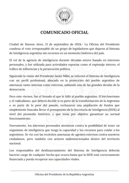 “La Oficina del Presidente condena el voto irresponsable de un grupo de legisladores que dejaron al Sistema de Inteligencia argentino sin recursos en un momento histórico del país”, dijo la cuenta presidencial a través de la plataforma X (ex Twitter).