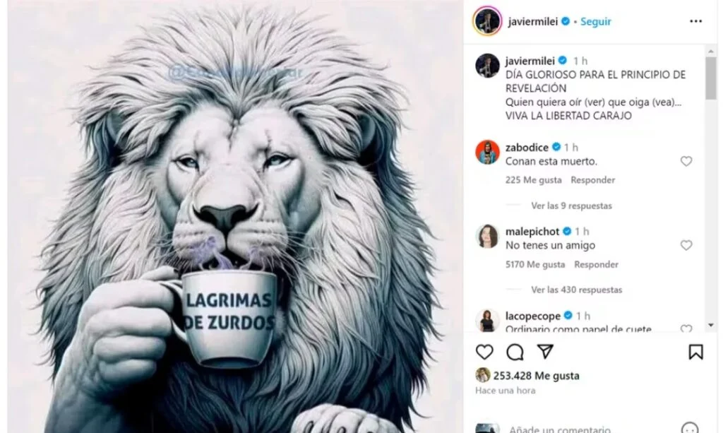 El presidente Javier Milei se expresó en sus redes sociales luego de las masivas marchas universitarias y apuntó: “Lágrimas de zurdos”, con una imagen de un león.
