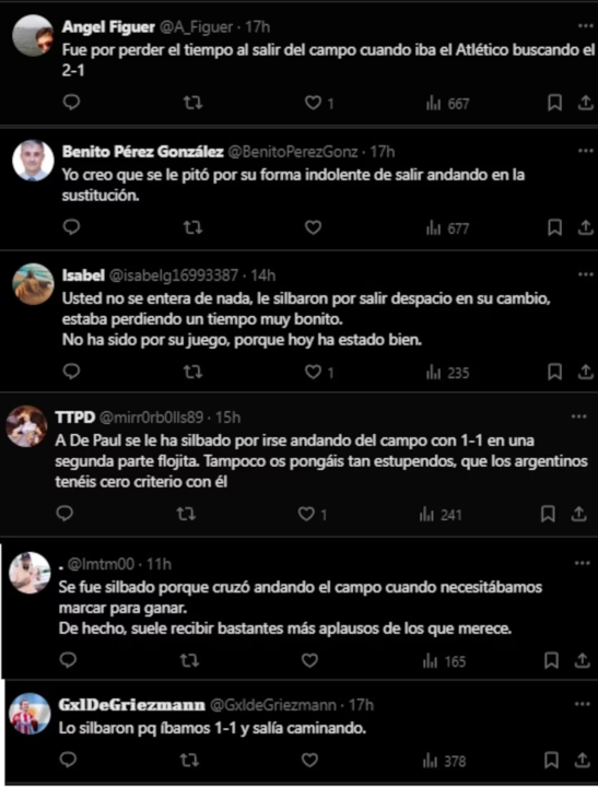 “Fue por perder el tiempo al salir del campo”, “se le pitó por su forma indolente de salir andando en la sustitución” y “le silbaron por salir despacio en su cambio, estaba perdiendo un tiempo muy bonito, no ha sido por su juego, porque hoy ha estado bien”, fueron algunas de las explicaciones que dejaron los hinchas en la red social X (antes Twitter).