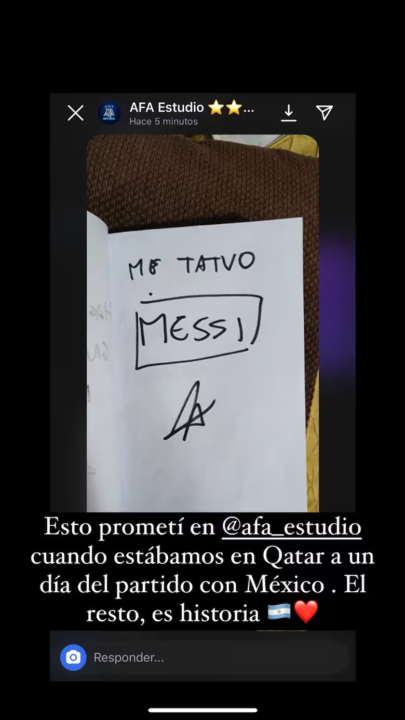 A continuación, publicó la foto del recuerdo en donde plasmó en una hoja su acuerdo. “Esto prometí a AFA Estudio cuando estábamos en Qatar a un día del partido contra México. El resto es historia”. Lo cierto es que en esa captura de una storie vieja, se puede ver que se trataba de la palabra “Messi”.