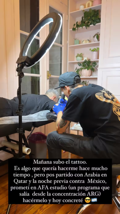 Más tarde, y con la incógnita acerca de cómo quedó el diseño, explicó: “Mañana subo el tattoo [por hoy]. Es algo que quería hacerme hace mucho tiempo. Pero post partido con Arabia Saudita en Qatar y la noche previa contra México, prometí en AFA Estudio [un programa que salía desde la concentración de ARG.] hacérmelo y hoy concreté”.