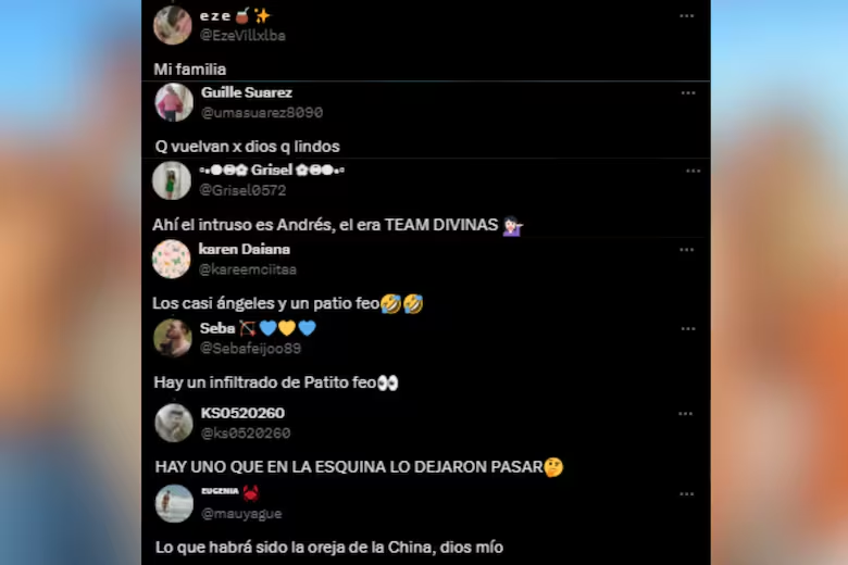 Si bien durante los últimos años varios de los actores trabajaron juntos y se encontraron en varios proyectos, el hecho de haberlos visto disfrutar del verano en grupo encantó a los fanáticos. Desde la cuenta de X de El ejército de LAM compartieron la publicación y los usuarios no tardaron en reaccionar.“Mi familia”y “Qué vuelvan por Dios, que lindos”, escribiero algunos. Además, otros se pronunciaron, con humor, sobre la presencia de Andrés Gil, quien perteneció a la competencia de Casi Ángeles: “Hay un infiltrado de Patito Feo”; “Los Casi Ángeles y un Patito Feo”; “Ahí el intruso es Andrés, el era team Divinas” y “Hay uno en la esquina que lo dejaron pasar”.