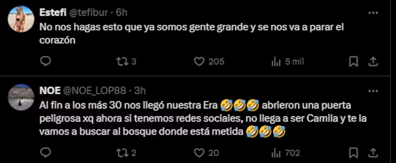“Te pido que sea Camila por Dios”; “No nos hagas esto que ya somos gente grande y se nos va a parar el corazón”; “Que puede estar haciendo Luisana de divertido en Vancouver. Por favor que se sume”; “No me lo puedo creer Benjamín Rojas me está dando un ataque, no nos podés dejar así, como sea Camila me va a dar algo” y “Ya estoy luchando con el tipito que no camina en la fila virtual”, fueron solo algunos de los comentarios de los admiradores que se visualizaron en cuestión de horas.
