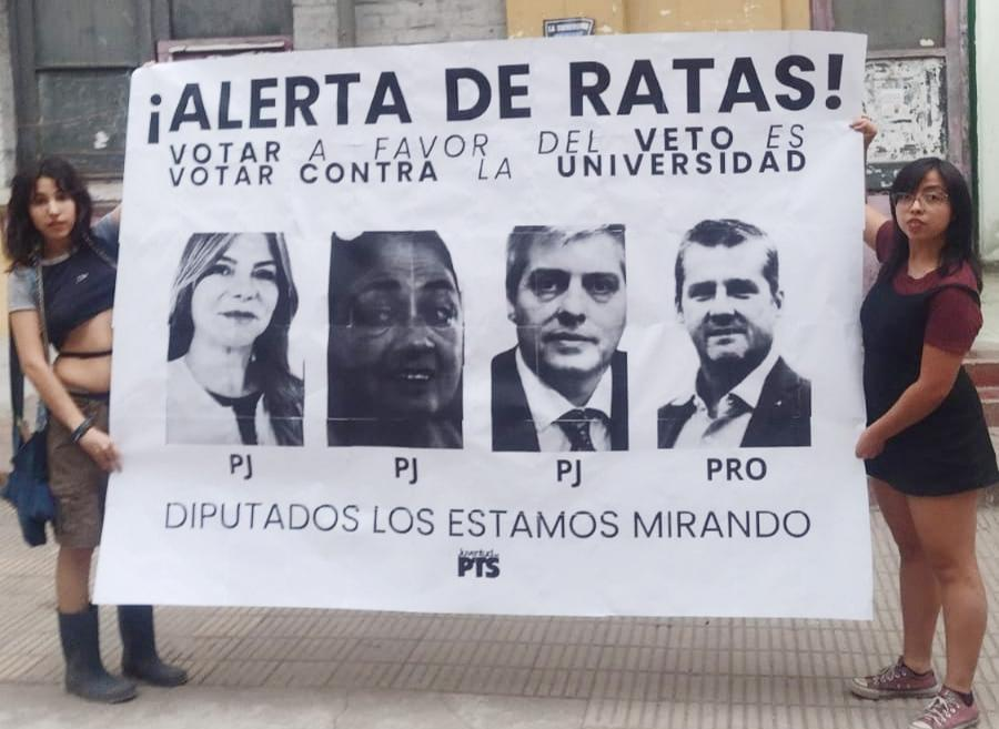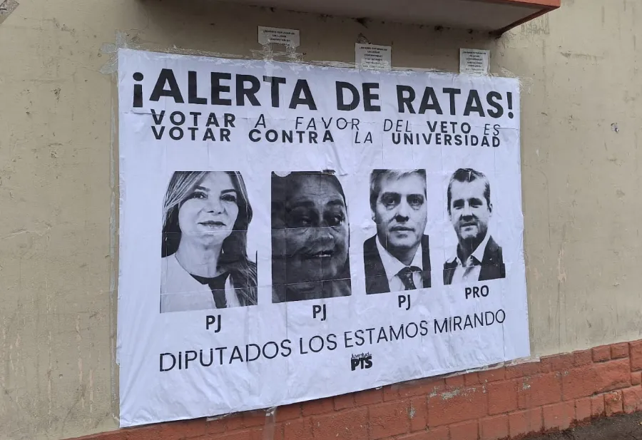 “¡Alerta de ratas! Votar a favor del veto es votar contra la universidad”, dicen los carteles pegados en al menos tres facultades de la Universidad Nacional de Tucumán (UNT): Filosofía y Letras; Artes y Ciencias Naturales. Abajo se ven las caras de los diputados Gladys Medina, Elia Marina Fernández, Agustín Fernández y Mariano Campero. El pedido surge en respuesta al veto de la Ley de Financiamiento Universitario firmado por el presidente Javier Milei el pasado jueves y que este miércoles será tratado en la Cámara de Diputados de la Nación. De allí surgirá si la ley queda descartada o ratificada.
