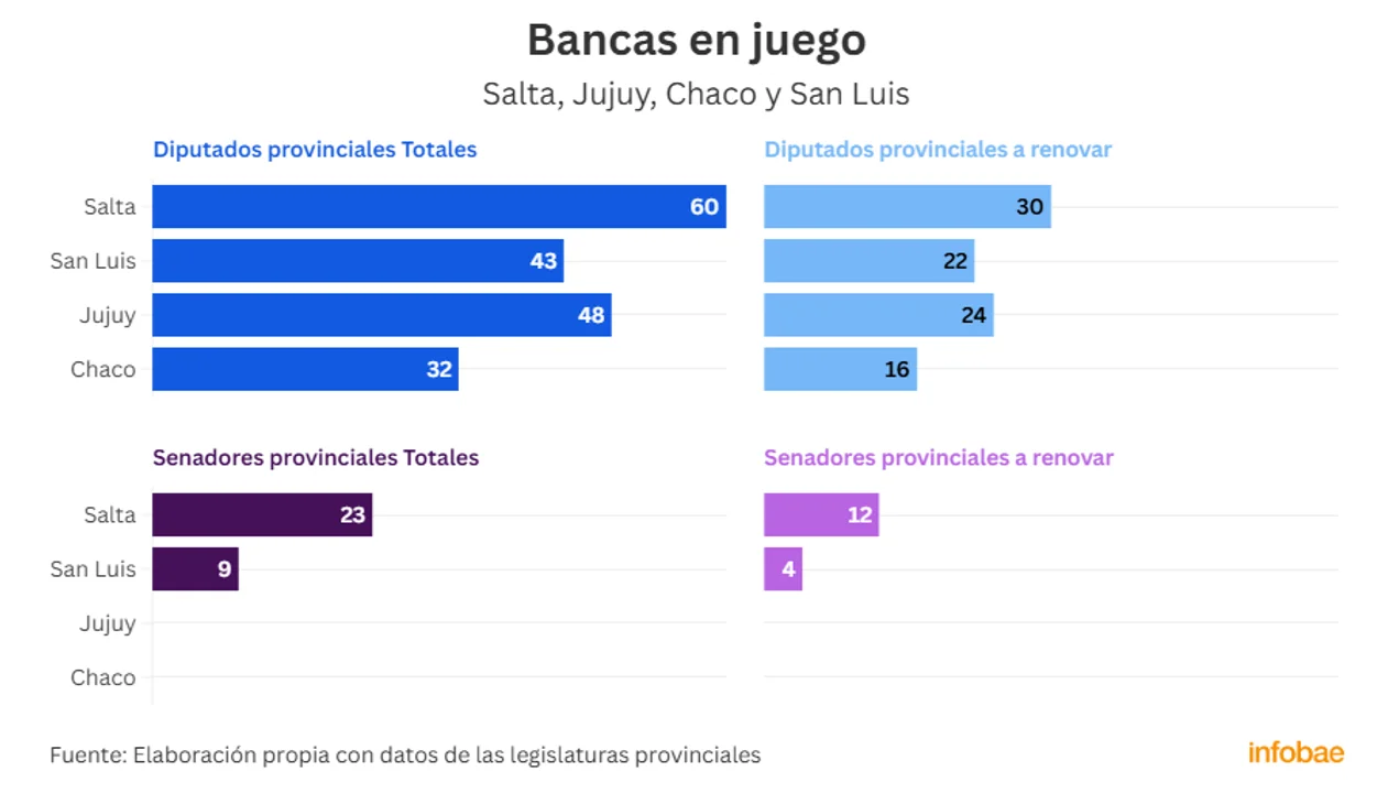 Si se suman las bancas de diputados en juego, la agrupación política que más bancas arriesga es el peronismo, con 31 escaños: 11 en Salta, 9 en San Luis, 6 en Jujuy y 5 en Chaco.