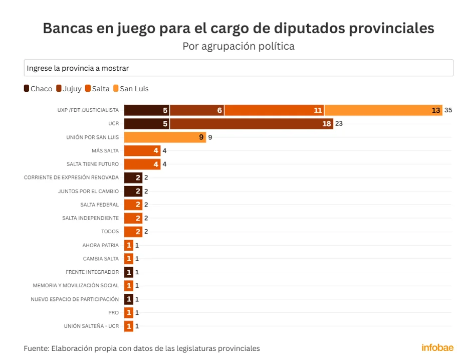 Le siguen las bancas de la UCR, que debe renovar 23 en total: 18 en Jujuy y 5 en Chaco. Y en tercer lugar, aparece Unión por San Luis, que arriesga 9 en esa provincia.