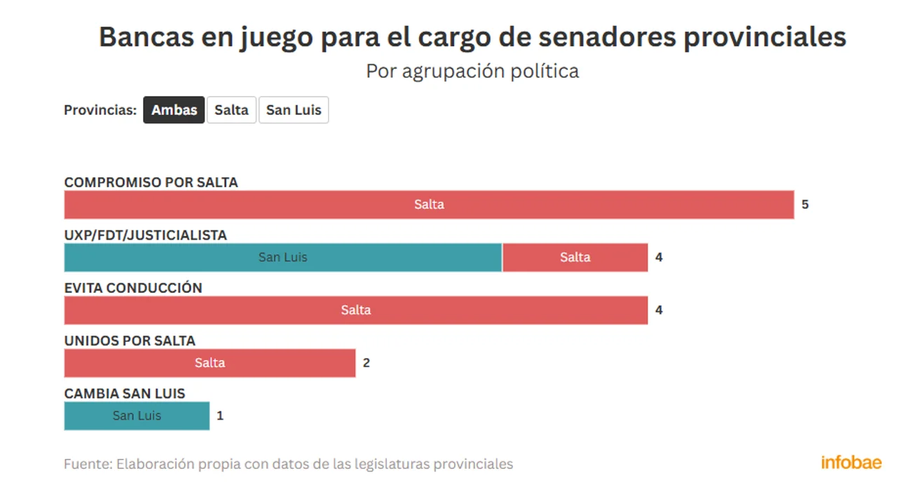 En cuanto a los senadores provinciales, en los dos distritos que eligen esos cargo, el partido que más arriesga es Compromiso por Salta (5 bancas). Le sigue el PJ con 4 bancas (3 de San Luis y 1 de Salta); y Evita Conducción, con 4 bancas de Salta.