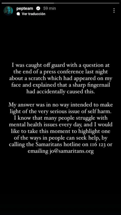 “Mi respuesta no pretendía de ninguna manera restar importancia al grave problema de la autolesión. Sé que muchas personas luchan con problemas de salud mental todos los días y me gustaría aprovechar este momento para resaltar una de las formas en que las personas pueden buscar ayuda: llamando a la línea directa de Samaritanos”, escribió Pep, quien luego publicó el número de teléfono y el mail de la organización para que se contacten todos aquellos que lo deseen.