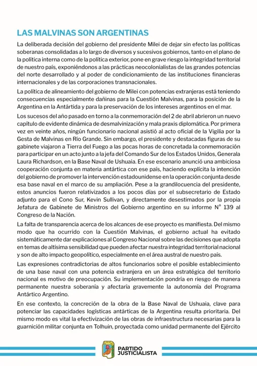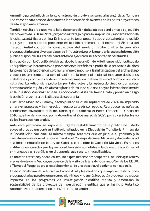 Cristina Kirchner reprodujo un documento del PJ donde señaló que el Gobierno de Milei actúa “a contramano de nuestra política de Estado” respecto a Malvinas. “Sin una fuerte apuesta a la consolidación de la presencia en el área austral, sin el fortalecimiento de las capacidades de defensa y sin una diplomacia activa, Argentina estará a merced de las grandes potencias“, afirmó.