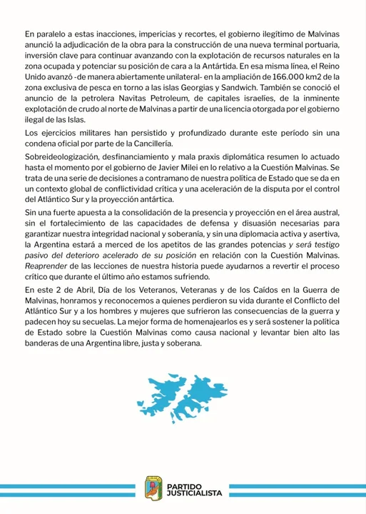 En el marco del Día del Veterano y de los Caídos, la ex mandataria destacó: “Gloria y honor a los combatientes y caídos en la Guerra de Malvinas”. El comunicado del PJ añadió que “la mejor forma de homenajearlos es sostener la política de Estado sobre Malvinas como causa nacional”.