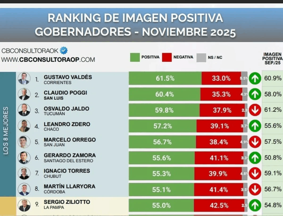 CB Consultora Opinión Pública publicó su habitual ranking de gobernadores. El primer mandatario de Tucumán, Osvaldo Jaldo, continúa en el podio con un 59,8% de imagen positiva ocupando el tercer lugar.