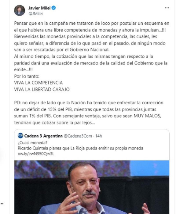 El presidente Javier Milei le respondió al gobernador de La Rioja, Ricardo Quinquela, sobre la propuesta de emitir una moneda propia en la provincia.