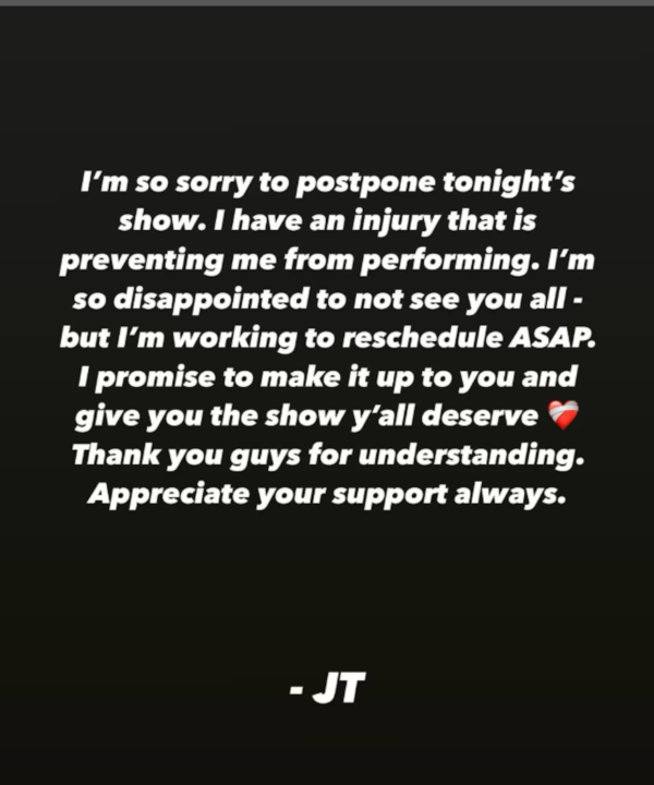 Justin Timberlake publicó un posteo en sus redes sociales que llamó la atención de sus seguidores. Unas horas antes de su actuación en Nueva Jersey, el cantante contó que no podía salir al escenario y que lo tenía que posponer.