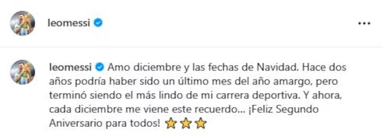 “Amo diciembre y las fechas de Navidad. Hace dos años podría haber sido un último mes del año amargo, pero terminó siendo el más lindo de mi carrera deportiva. Y ahora, cada diciembre, me viene este recuerdo… ¡Feliz Segundo Aniversario para todos!”, escribió la Pulga mediante su cuenta de Instagram.