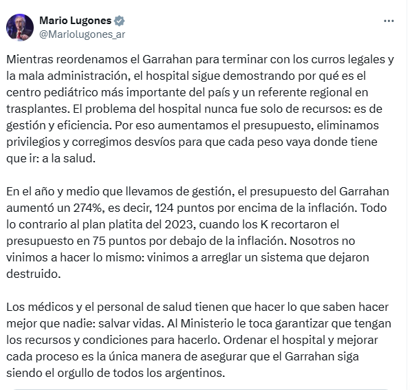 “Los médicos y el personal de salud tienen que hacer lo que saben hacer mejor que nadie: salvar vidas. Al Ministerio le toca garantizar que tengan los recursos y condiciones para hacerlo. Ordenar el hospital y mejorar cada proceso es la única manera de asegurar que el Garrahan siga siendo el orgullo de todos los argentinos“, completó el texto que citó un mensaje de las cuentas oficiales del centro de salud.