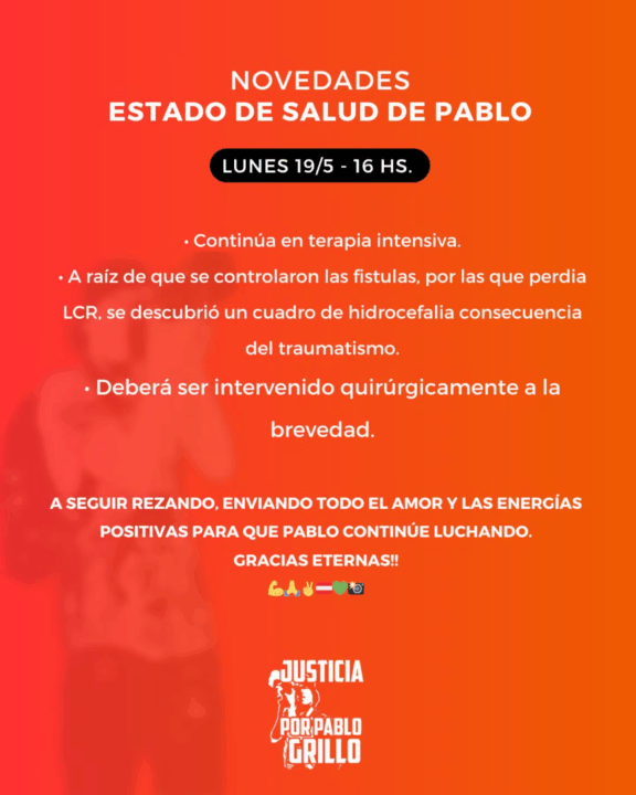 Detallaron que, “a raíz de que se controlaron las fístulas por las que perdía líquido cefalorraquídeo, se descubrió un cuadro de hidrocefalia consecuencia del traumatismo”. Por ese motivo, “deberá ser intervenido quirúrgicamente a la brevedad”.
