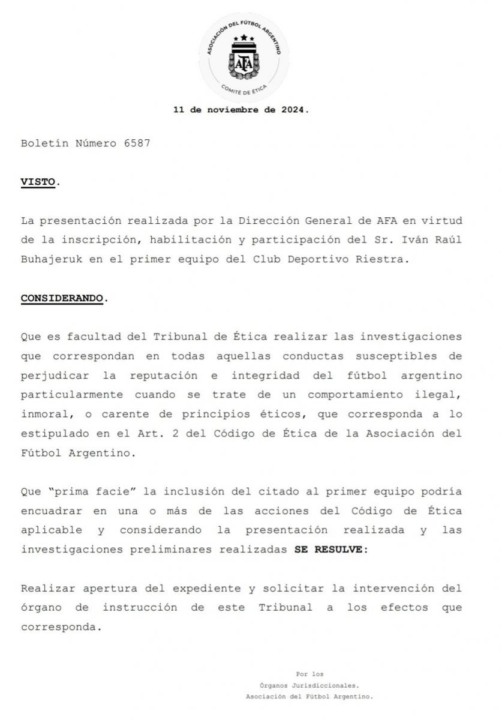 La Dirección General de la AFA solicitó la apertura de un expediente porque considera que podría tratarse de una situación carente de principios éticos.