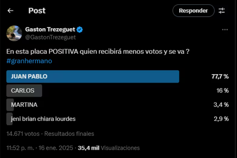 La encuesta del ex participante de Gran Hermano, Gastón Trezeguet también coinciden en esta línea. Según la votación realizada en X, el 77,7% de los televidentes espera que abandone la casa Juan Pablo y un 16% Carlos.