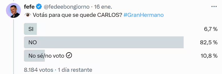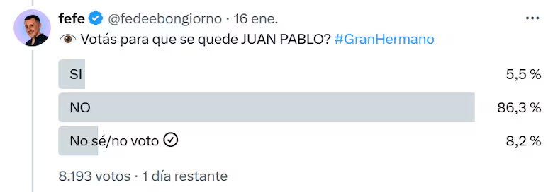 De acuerdo con los relevamientos realizados por el especialista en Gran Hermano, Fede Bongiorno, en su cuenta de X, solo un 5,5% de 8.193 usuarios desean que siga en juego Juan Pablo, mientras que un 6,7% de 8.184 prefiere que lo haga Carlos.