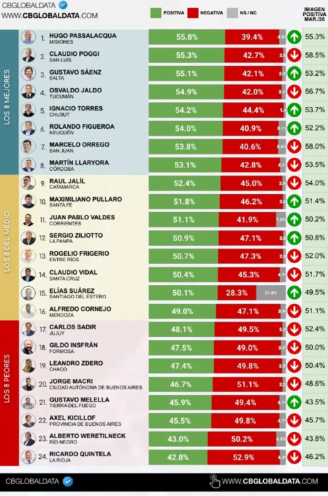El informe, que mide la valoración pública en las 24 provincias, muestra además a otros mandatarios con niveles similares de imagen positiva, como Ignacio Torres (Chubut), Rolando Figueroa (Neuquén), Marcelo Orrego (San Juan) y Martín Llaryora (Córdoba). En el extremo opuesto, el gobernador de La Rioja, Ricardo Quintela, aparece en el último lugar con un 42,8%.