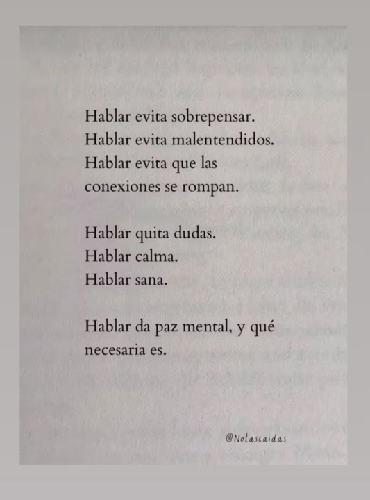 Minutos más tarde, compartió una reflexión sobre la importancia de poder hablar: “Hablar evita sobre pensar. Hablar evita malentendidos. Hablar evita que las conexiones se rompan. Hablar quita dudas. Hablar calma. Hablar sana. Hablar da paz mental, y qué necesaria es”.