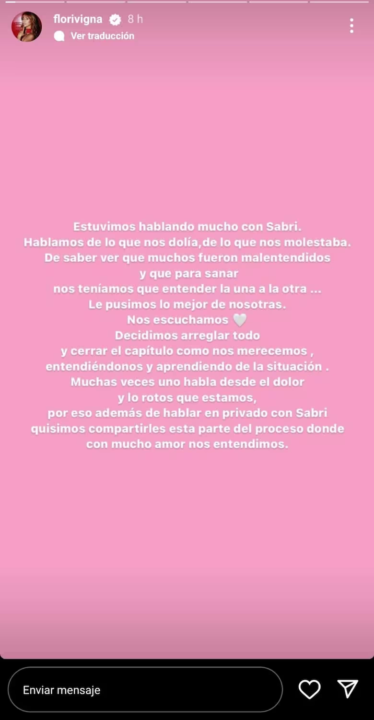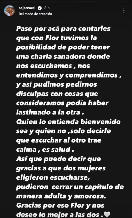 Luego, siguió: “Quien lo entienda bienvenido sea y quien no solo decirlo que escuchar al otro trae calma, es salud. Así que puedo decir que gracias a que dos mujeres eligieron escucharse, pudieron cerrar un capítulo de manera adulta y amorosa. Gracias por eso Flor y nos deseo lo mejor a las dos”.