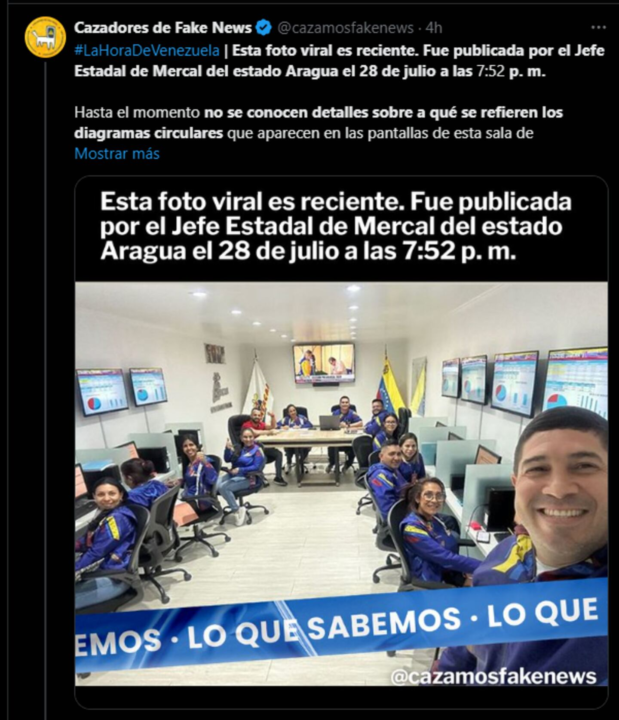 “Esta foto viral es reciente. Fue publicada por el Jefe Estadal de Mercal del estado Aragua el 28 de julio a las 7:52 p. m. Hasta el momento no se conocen detalles sobre a qué se refieren los diagramas circulares que aparecen en las pantallas de esta sala de monitoreo. Pero la foto sí es reciente. Fue publicada anoche en la cuenta de Instagram de Rubén Flores, Jefe Estadal de Mercal (uno de los programas sociales del gobierno) del estado Aragua”, señaló el posteo.